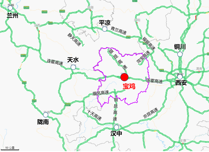 寶雞古稱陳倉(cāng),地處關(guān)中平原西部,是我國(guó)亞歐大陸橋上第三個(gè)大十字樞紐和全國(guó)性綜合交通樞紐城市之一。為發(fā)揮交通運(yùn)輸對(duì)寶雞經(jīng)濟(jì)和關(guān)中平原城市群發(fā)展的先導(dǎo)性和支撐作用,寶雞市政府出臺(tái)《關(guān)于加快構(gòu)建全國(guó)性綜合交通樞紐的意見(jiàn)》,提出到2025年末要建成“內(nèi)通外聯(lián),公鐵互補(bǔ)、空地立體、銜接順暢”的全國(guó)性綜合交通樞紐,市域范圍規(guī)劃形成“三橫兩縱兩環(huán)”高速公路網(wǎng)。