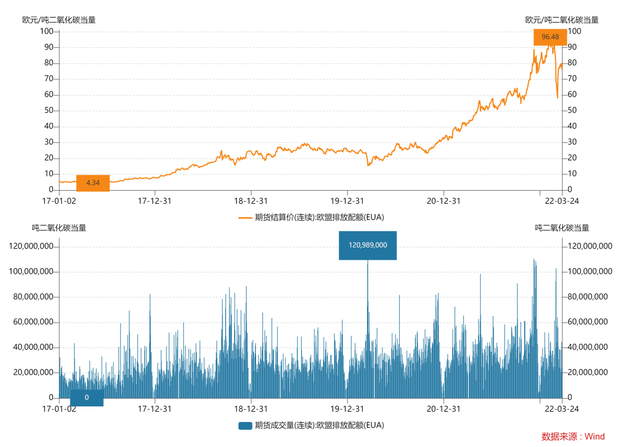 圖 5歐盟碳排放配額歷史結(jié)算價(jià)及成交量