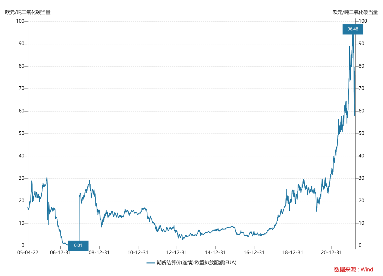 EU-ETS,譯為歐盟碳排放交易體系,自05年運(yùn)行至今已囊括了歐盟28個(gè)國(guó)家,是目前全球最大的碳排放交易市場(chǎng),交易標(biāo)的主要為按計(jì)劃分配的歐盟碳排放額(EUA)以及作為補(bǔ)充的由CDM項(xiàng)目產(chǎn)生的核證減排量(CERs)。筆者選取了EUA場(chǎng)內(nèi)交易份額最大的美國(guó)洲際交易所(ICE)歷史交易數(shù)據(jù)進(jìn)行分析,歷史最低價(jià)接近0元,歷史最高價(jià)近700元,近期價(jià)格基本穩(wěn)定在400元。歐盟碳排放配額歷史結(jié)算價(jià)如下圖所示: