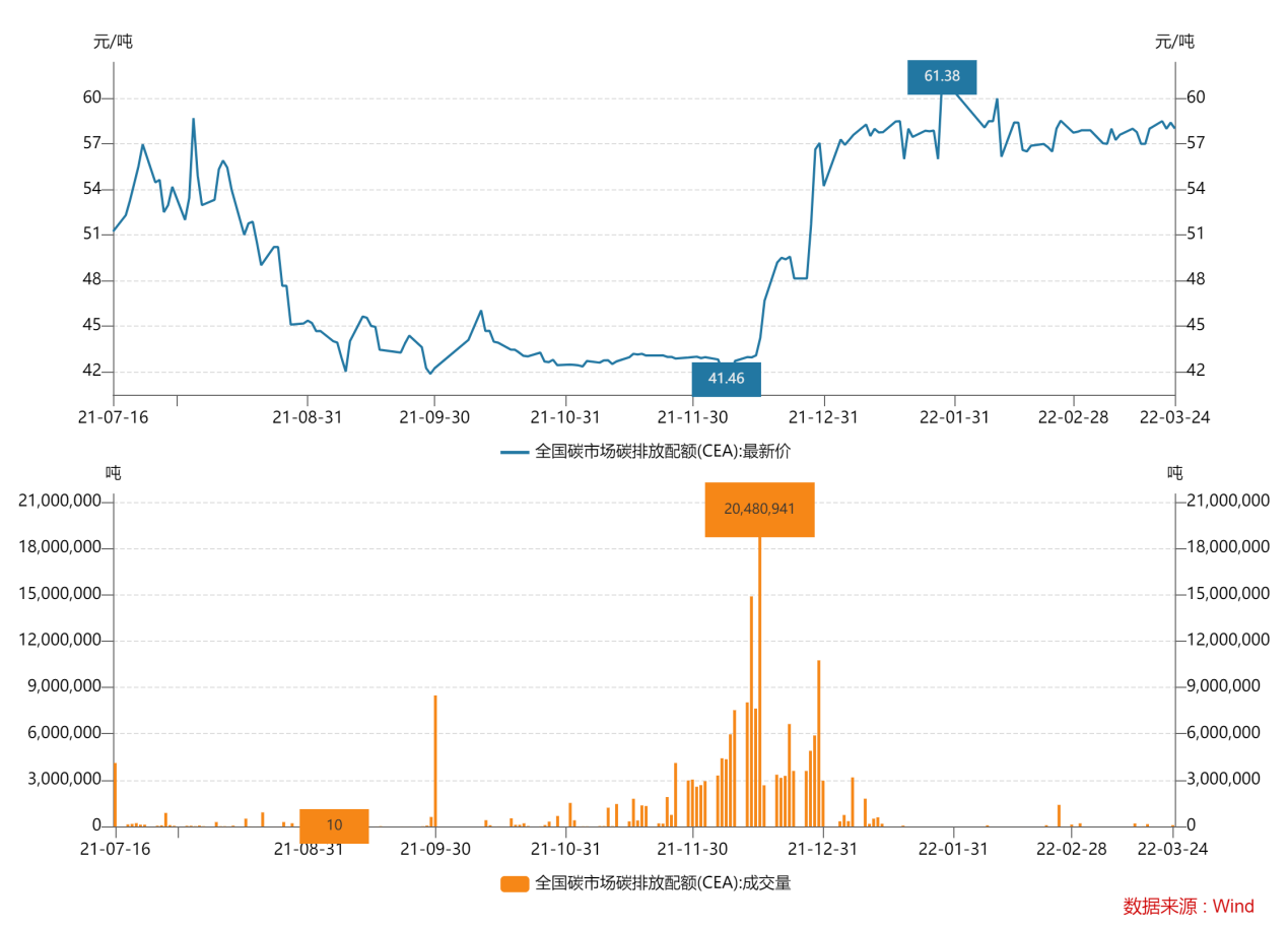 上圖可見(jiàn),2021年7月全國(guó)碳排放交易所正式上線后,一定程度上打破了過(guò)去地方碳交易所的區(qū)域壁壘,碳配額價(jià)值更趨于合理,全國(guó)碳排放交易所的最新CEA成交價(jià)約為58元/噸,對(duì)標(biāo)歐盟EU-ETS的EUA價(jià)格僅為其7分之1,因此對(duì)于碳配額CEA的未來(lái)價(jià)格趨勢(shì),筆者認(rèn)為隨著“3060”政策的不斷延伸,未來(lái)市場(chǎng)主體將擴(kuò)展至八大高能耗行業(yè)乃至全部行業(yè),然而碳配額總量是一定的并可能逐年減少,故長(zhǎng)期來(lái)看,碳配額價(jià)格將穩(wěn)定上行,類似前文EUA走勢(shì)。