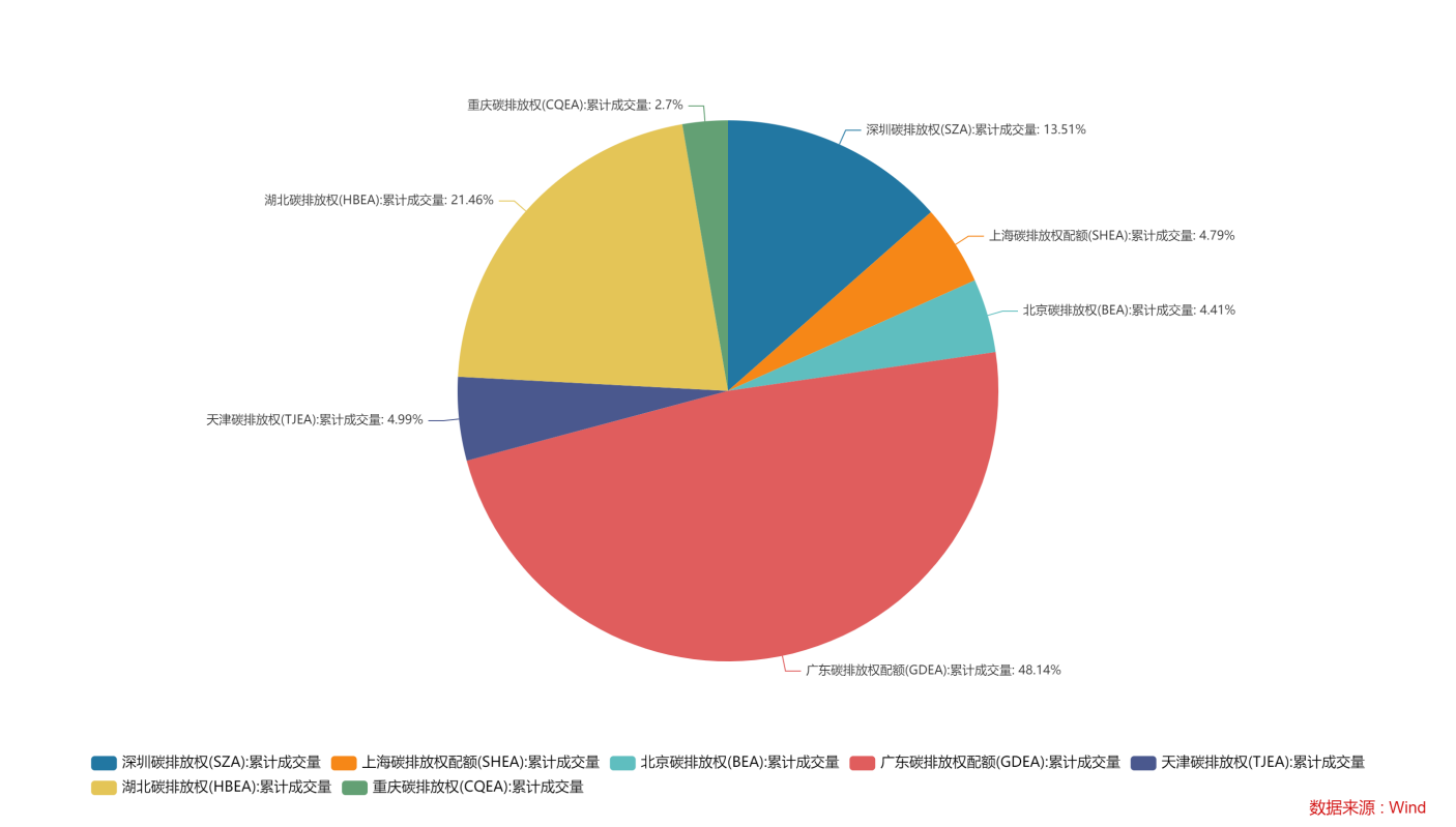 我國(guó)于十二五期間正式提出轉(zhuǎn)變經(jīng)濟(jì)結(jié)構(gòu)、控制二氧化碳排放,并先后在七個(gè)省市開(kāi)展了碳排放權(quán)交易試點(diǎn)工作。交易標(biāo)的為碳排放配額(CEA,地方交易所命名方式不同),CEA類似歐盟的EUA,也是由政府自上而下完成分配。若企業(yè)實(shí)際碳排放量小于政府分配的配額,則企業(yè)可以通過(guò)交易多余碳配額,來(lái)實(shí)現(xiàn)碳配額在不同企業(yè)的合理分配。CEA由省級(jí)生態(tài)環(huán)境主管部門免費(fèi)或有償分配,各省的碳排放配額,則由生態(tài)環(huán)境部根據(jù)國(guó)家溫室氣體排放控制要求綜合考慮后制定。地方試點(diǎn)的積極推進(jìn)為后續(xù)全國(guó)碳市場(chǎng)建設(shè)積累了寶貴經(jīng)驗(yàn),根據(jù)生態(tài)環(huán)境部公布的數(shù)據(jù),截至2021年6月全國(guó)碳市場(chǎng)上線前,地方性試點(diǎn)市場(chǎng)已基本覆蓋了電力、鋼鐵、水泥等20多個(gè)行業(yè)近3000家重點(diǎn)排放單位,累計(jì)配額成交量4.8億噸二氧化碳當(dāng)量,成交額約114億元。但地方試點(diǎn)的局限性同樣明顯,由于此階段各交易所主體僅限省市范圍內(nèi)控排企業(yè),具有明顯的區(qū)域壁壘特征,同時(shí)源于各省市產(chǎn)業(yè)結(jié)構(gòu)、經(jīng)濟(jì)發(fā)展水平、溫室氣體控制目標(biāo)不同,各交易所配額價(jià)格及成交量呈現(xiàn)明顯差異。截至2022年3月,廣州+深圳碳排放權(quán)配額累計(jì)成交量占全國(guó)市場(chǎng)的份額超60%,而重慶、天津、上海、北京則不足5%,由此也間接證明了廣東在全國(guó)節(jié)能減排、經(jīng)濟(jì)結(jié)構(gòu)轉(zhuǎn)型上依然走在改革前沿。七大碳排放交易所累計(jì)成交量占比如下圖所示(注:福建碳排放交易所未公布累計(jì)成交量,暫不納入統(tǒng)計(jì)):