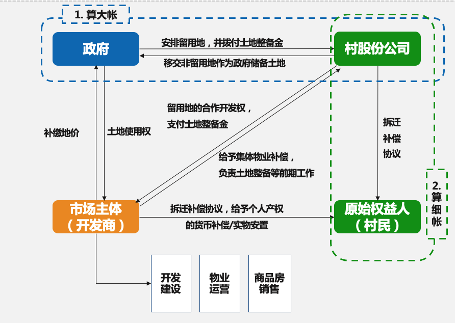 (2)在村股份公司與相關(guān)權(quán)益人“算細(xì)賬”層面,村股份公司協(xié)同市場(chǎng)主體(即開發(fā)商)與原始權(quán)益人(即村民等)簽訂三方拆遷補(bǔ)償協(xié)議。開發(fā)商負(fù)責(zé)對(duì)集體物業(yè)和村民個(gè)人產(chǎn)權(quán)給予貨幣補(bǔ)償或?qū)嵨锇仓?,從而確保權(quán)益人相關(guān)權(quán)益,實(shí)現(xiàn)整備范圍內(nèi)全面征轉(zhuǎn)清拆;