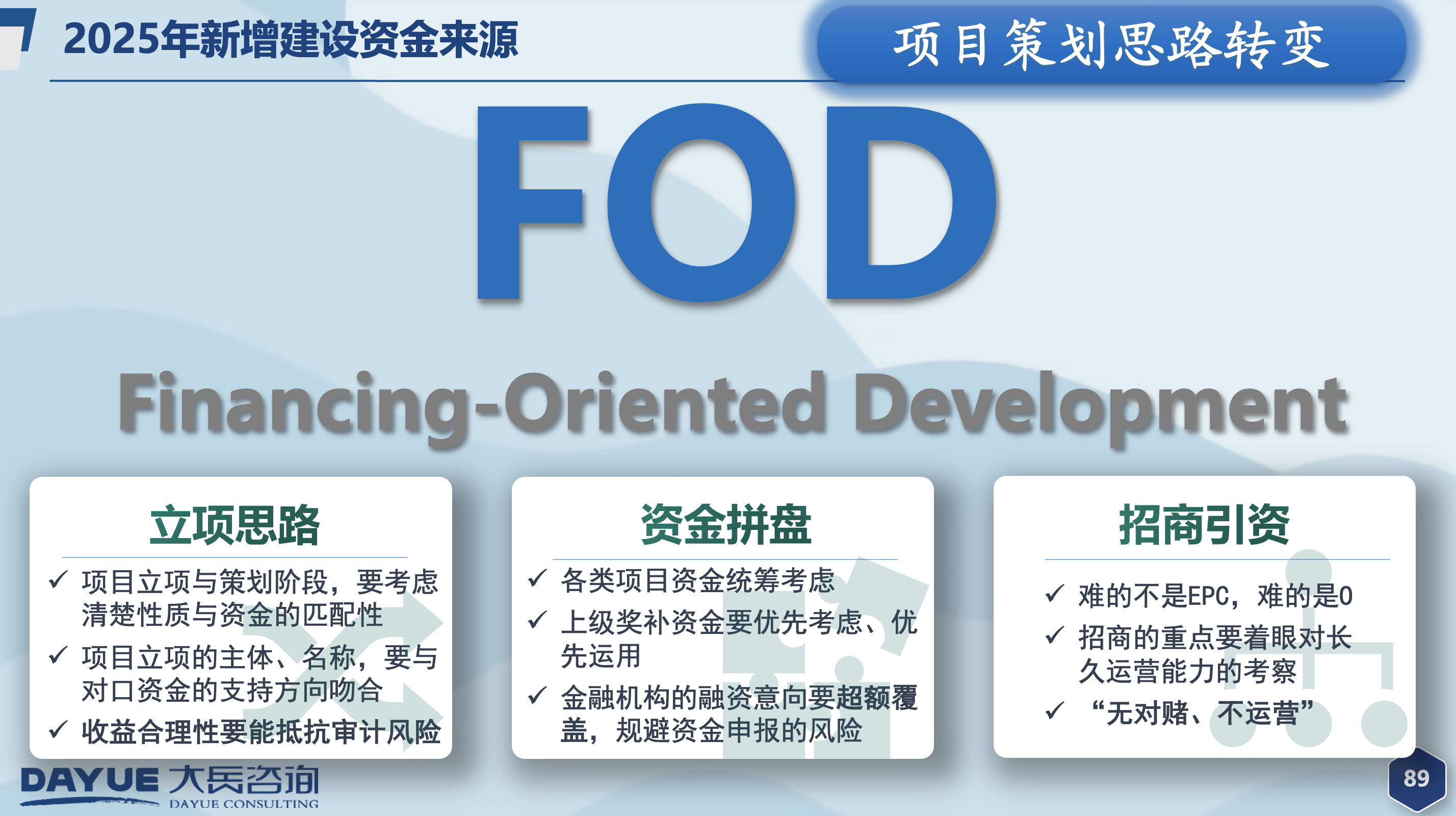大岳咨詢以“提高投資與管理效率,助力經(jīng)濟(jì)和社會發(fā)展”為使命。近年來,公司持續(xù)為全國多地提供專項債、超長期特別國債、中央預(yù)算內(nèi)投資以及城市更新、全域土地綜合整治等熱點領(lǐng)域的咨詢服務(wù),積累了豐富的政策研究經(jīng)驗及項目實操經(jīng)驗。未來,大岳咨詢將繼續(xù)專注于為城市高效建設(shè)添磚加瓦,為地方高質(zhì)量發(fā)展提供堅實專業(yè)支撐。
